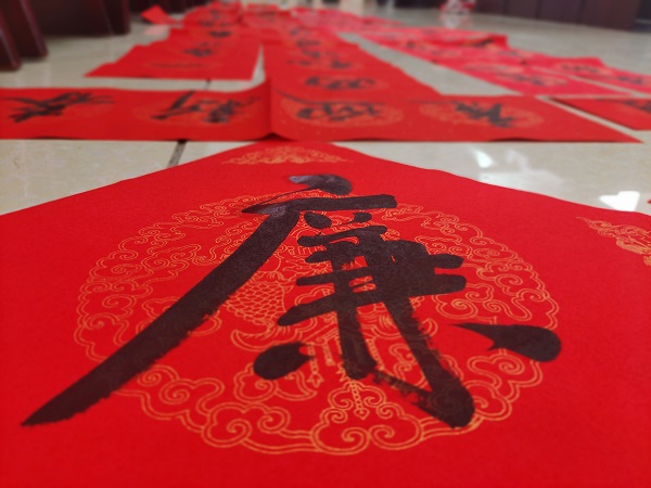 飽蘸廉潔元素的喜慶“廉”字,為廣大黨員干部和群眾送上新年廉潔祝福。(王龍芹 攝)