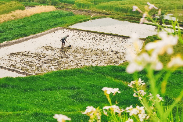 初春輕盈,生機盎然,辛勤的農民在雨水節氣開始平整秧田,為新一季的秧苗培育做準備。(王龍芹 攝)
