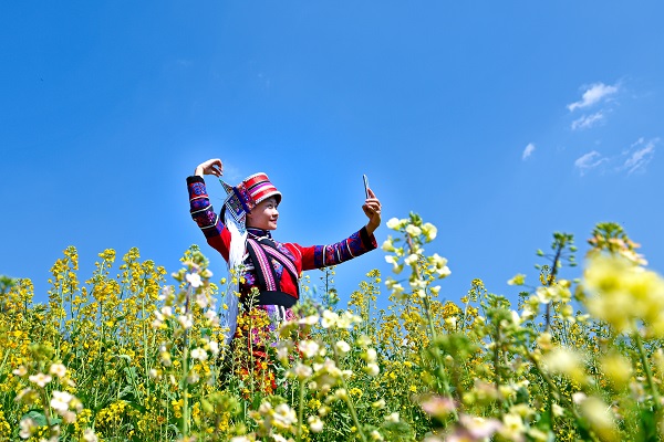 雨水時節,宜良縣九鄉彝族回族自治鄉千畝油菜花正在盡情綻放。金燦燦的油菜花像金色綢緞鋪在遼闊的大地上,游客們身著少數民族服裝在花海中暢享自拍歡樂,人與自然共同繪就了一幅春天的畫卷。(劉紅艷 攝)