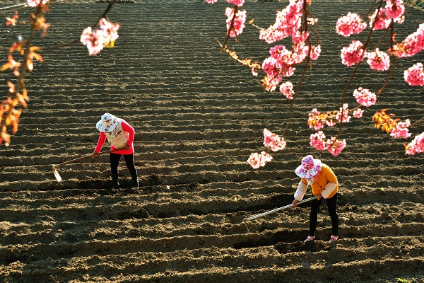 一年之計在于春。在“可耕之候”的雨水節氣,勤勞樸實的農民們扛著鋤頭來到田地,或翻松土壤,或清溝瀝水除雜草,忙得不亦樂乎。(孔賓 攝)
