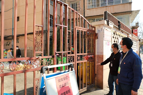 盤龍區紀檢監察干部在封控區外圍了解相關情況。