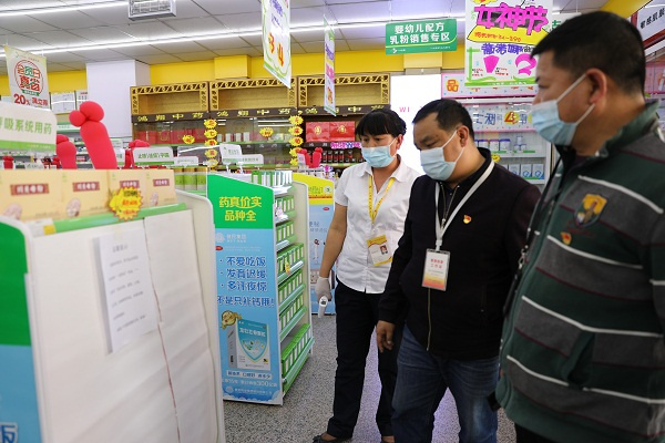 盤龍區紀檢監察干部在藥店了解“一退兩抗”藥品暫停銷售情況。