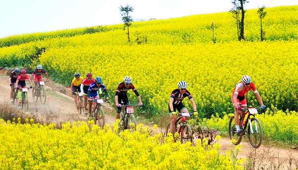 春分時節,曲靖市百萬畝油菜花盛開,吸引廣大騎行愛好者來到花海中騎行健身,感受春日美景。(文萍 攝)