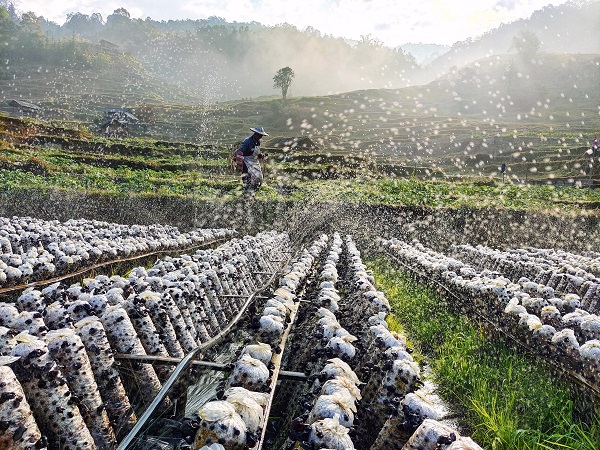 眼下正是黑木耳春管的關鍵時期,龍陵縣龍江鄉的農民們搶抓農時,一大早就給菌包澆水施肥,確保今年黑木耳增產增收。(王龍芹 攝)