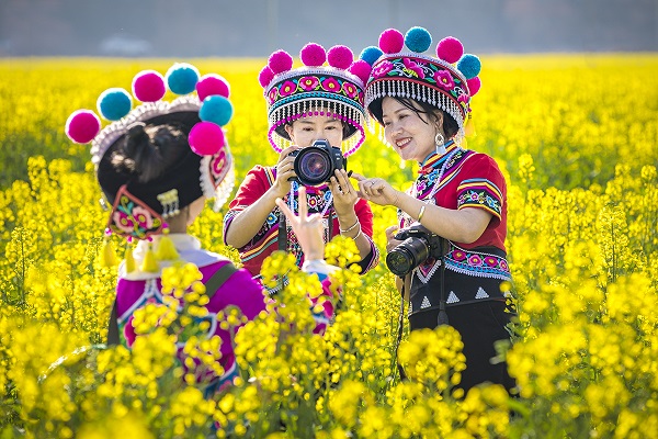春分時節,牟定縣蟠貓鄉劉家村的油菜花開成了一片黃色的海洋,眾多游客和攝影愛好者到此踏青賞花, “打卡”拍照。(李光洪 攝)