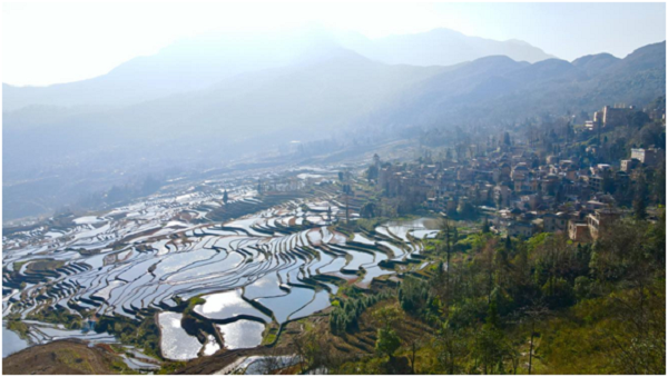 春分時節,哈尼梯田春意盎然,滿眼皆是山水、村寨、綠植,與五彩的梯田相得益彰,鋪開了一幅渾然天成的自然和諧畫面。(李少福 攝)