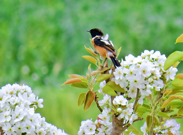 清明時節,氣候暖和,草木萌發,枝頭朵朵花兒競相吐蕊、爭芳斗艷,引來鳥兒駐足聞香。(馮雪娥 攝)