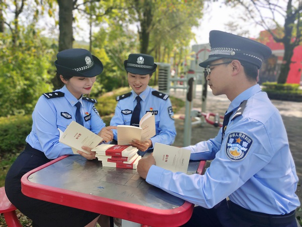 公安干警利用業(yè)余時(shí)間交流叢書(shū)學(xué)習(xí)心得。(王龍芹 攝)