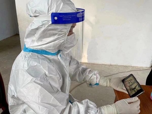 在孟連縣疫情防控關鍵階段,紀檢監察干部在一線參與防控工作的間隙,通過手機觀看口袋書中的小視頻。(劉文萍 攝)