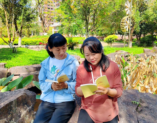 江城縣紀檢監察干部人手一套口袋書,隨身攜帶、隨時翻學。圖為紀檢監察干部茶余飯后,利用碎片化的時間學習口袋書。(雷紅艷 攝)