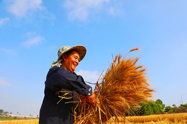 小麥豐收,村民們把豐收的喜悅扎成捆、裝進包,顆粒歸倉。(王銘堅 攝)
