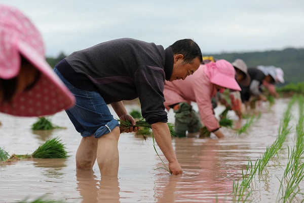 清溝引水、蓄水浸田、栽秧插秧,農民們在稻田里躬身插秧,播種希望。(龔曉 攝)