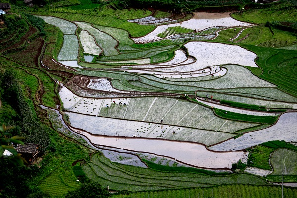 一場雨過后,騰沖大地飽浴甘霖,農田里蓄滿了水,田間地頭到處是穿梭的身影,形成一幅熱鬧的畫卷。(解宏偉 攝)