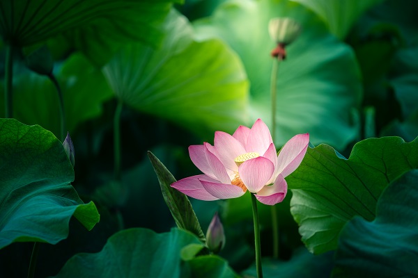池塘里朵朵荷花緊緊地依偎著碧綠的、滾圓的荷葉,在陽光的沐浴下,顯得更加雅潔、清秀。(陳思思 攝)