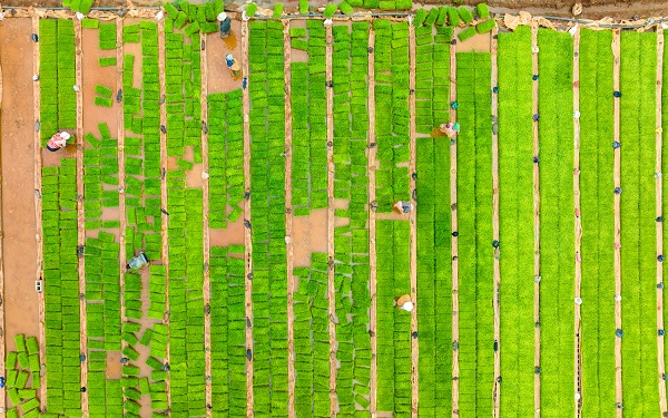 夏至農忙正當時。秧苗基地里,農民們在整理放置苗盤,一片片秧苗在陽光的照耀下更顯綠意盎然。(趙洋 攝)