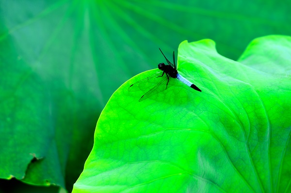 小荷才露尖尖角,早有蜻蜓立上頭。清風掠過,蜻蜓乘風來到翠綠的荷葉上。(盧維前 攝)