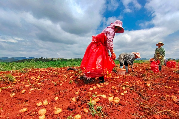 夏至前后,春馬鈴薯進入收獲期,在陸良縣小百戶鎮中壩村羊頭山新型馬鈴薯示范種植基地里,薯農們對馬鈴薯進行分揀、裝袋、搬運,田間地頭呈現出一派繁忙的豐收景象。(王勇 攝)