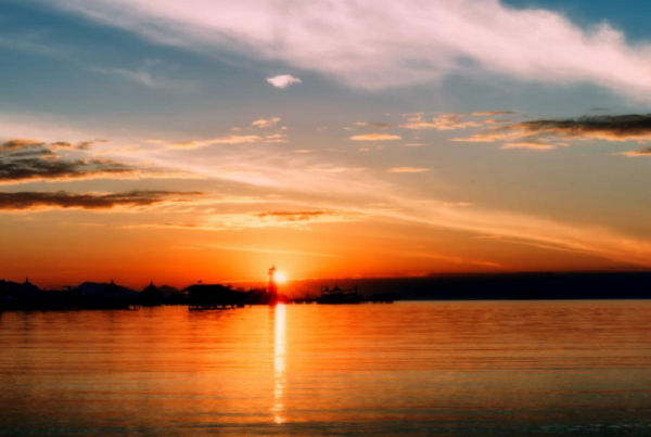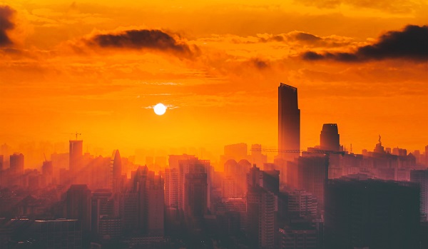 小暑入伏天,惹得人們水岸納清涼,巧遇夕陽西下,漫天飛霞,滿目金光。(馮伯韜 攝)