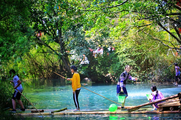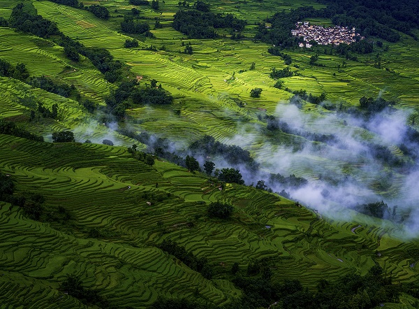 “溫風蟲鳴小暑天,心定美好自清涼。”小暑時節,美麗的元陽箐口村舒適地躺在層層綠意盎然的梯田懷抱中,沐浴著黨的恩情。(羅涵 攝)