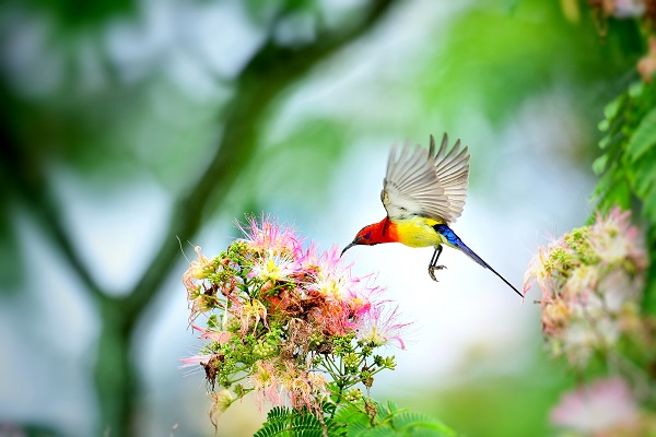 一團團、一簇簇合歡花像一把把毛茸茸的小扇子,鳥兒嗅著香味翩翩而來,大地處處呈現出一派生機勃勃的景象。(馬志東 攝)