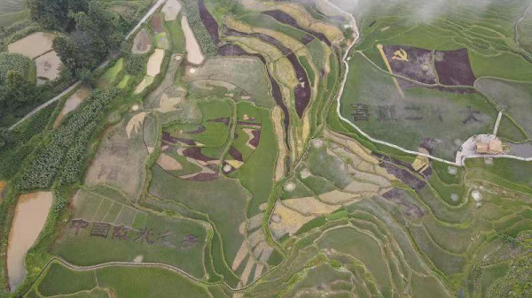 位于世界文化遺產(chǎn)哈尼梯田核心區(qū)域的紅河哈尼族彝族自治州元陽縣阿者科村,勞動者們以梯田為畫板,以不同顏色的水稻為墨,繪制了一幅“喜迎二十大”的梯田稻畫,表達了邊疆人民心向黨的真摯情感。(元陽縣紀委監(jiān)委 普健梅 攝)
