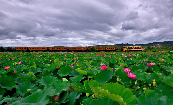 團團荷葉,灼灼紅蓮。在建水縣團山民居村落邊,一列觀光小火車行駛在百年米軌之上,從荷葉鋪就的碧綠中,緩緩駛向遠方。(建水縣紀委監(jiān)委 宗慶 攝)