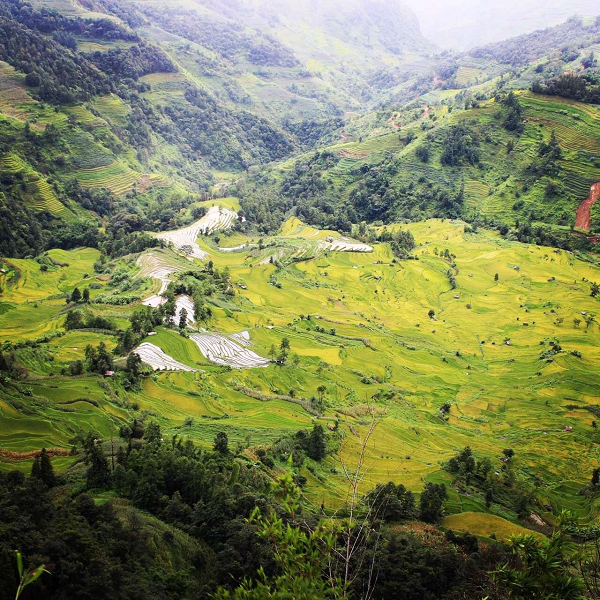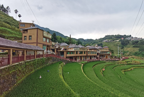 梯田里的稻谷由于栽種時間的差異,成熟度也有差別,從而展現(xiàn)出不一樣的“只此黃綠”色彩,到秋天這里將是一片金黃的豐收景象。(河口縣紀委監(jiān)委 施佳輝 攝)
