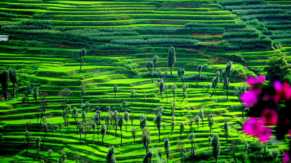 碧禾浪涌梯田綠,夏至山巒翠綰紗。夏日的楊柳梯田,宛如鋪好了綠色絨毯的天梯,層層盤繞、如鏈似帶,襯得那最不起眼的山花,也成了最突兀的存在。(紅河縣紀委監(jiān)委 陳永貴 攝)