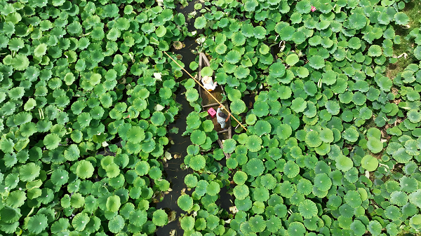 盛夏,荷塘碧綠蒼翠,水面上荷葉挨挨擠擠、層層疊疊鋪展開來,接天蓮葉,甚似壯闊,引得游人乘舟而來,近距離欣賞這荷葉田田的美景。(個舊市紀委監(jiān)委 馬子豪 攝)