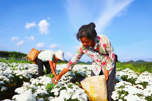 此時正是翠菊采摘的時候,雪白的翠菊如碧海中倒映的白云,像玉盤里散落的珍珠。(王銘堅 攝)