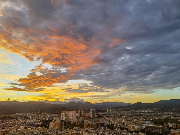雖已處暑,暑氣漸消,但天邊的夕陽依然火紅而熱烈,暈染著天際,給這座小城披上了一件鮮艷的衣裳。(普艷華 攝)