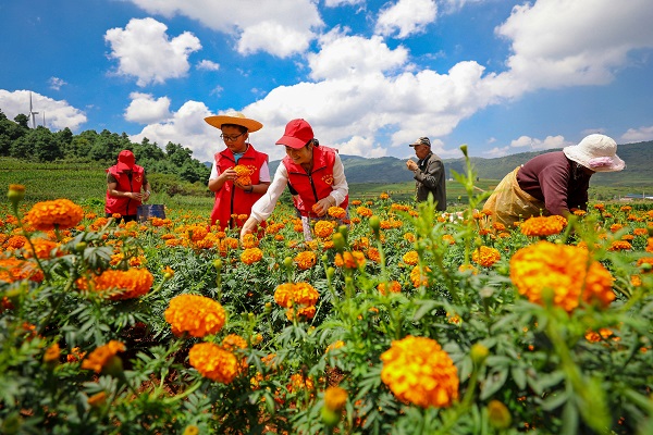 一席秋風涼,黃花遍地香。處暑時節,陸良縣活水鄉雨麥紅村的千畝萬壽菊競相綻放,花海連綿,小朋友跟著家長一起參加志愿服務活動,幫助花農采摘萬壽菊。(王勇 攝)