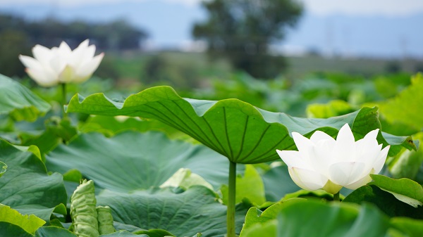 “灼灼荷花端,亭亭出水中”。白朵朵荷花,靜立風中,在初秋陽光的映襯下,泛著耀眼的光。(李文艷 攝)