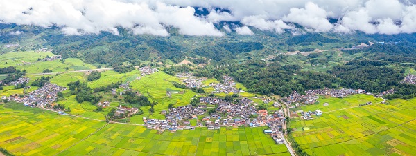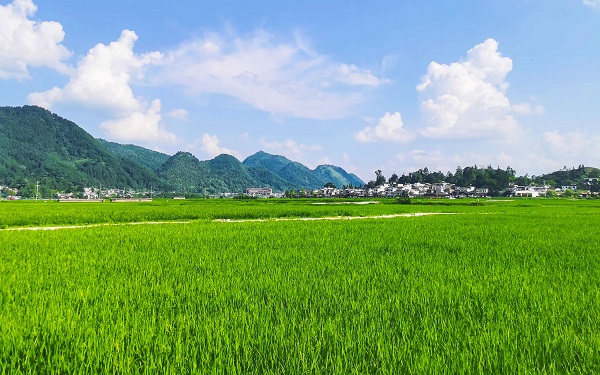 暑去秋來,天氣漸涼。稻田里的水稻長勢喜人,滿眼碧綠,與村莊相映成趣,美不勝收。(楊保宇 攝)