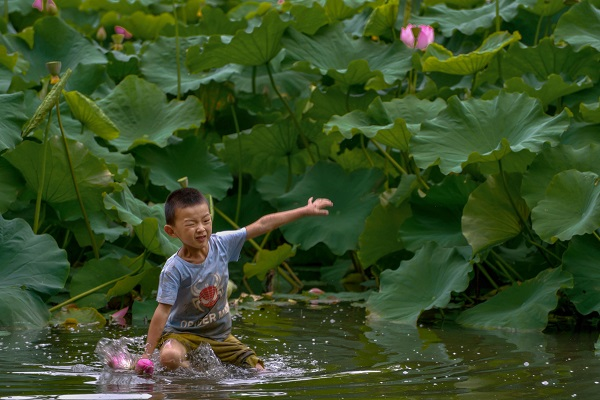 處暑時節,村口的荷塘成了孩童們嬉戲玩耍的游樂場,打水仗、摘荷花、追小魚……孩子們盡情地撒歡,歡聲笑語在青山碧水間回蕩。(宗慶 攝)