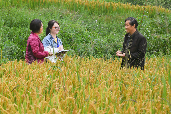 糧食生產直接關系農民群眾的“糧袋子”和“錢袋子”。圖為綏江縣紀檢監(jiān)察干部走進田間詳細了解今年水稻生長、收割情況,督促有關部門做好技術指導、政策宣傳等工作,以精準監(jiān)督護航糧食安全。
