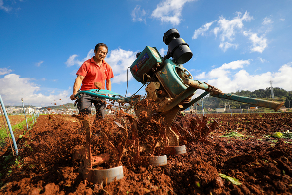 冬晴正要飽耕犁。立冬時(shí)節(jié),陸良縣芳華鎮(zhèn)龍?zhí)渡鐓^(qū)的露天蔬菜種植基地里,菜農(nóng)正在對(duì)已采收的菜地進(jìn)行耕犁、除蟲、曬垡,為新一茬播種做好準(zhǔn)備。(王勇 攝)