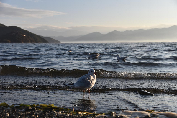 初冬的瀘沽湖,景色別致,綠水青山,藍(lán)天白云,湖水清澈見底,豬槽船湖中搖曳,自由翱翔在天空中的越冬候鳥如精靈般點(diǎn)綴著瀘沽湖。(趙慶祖 攝)