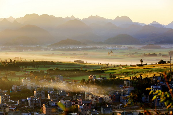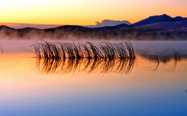 清晨,遠方的旭日將天空染得金黃,縹緲的薄霧為綿延群山遮住了晚起的嬌羞,水草踩著金色的光芒舞蹈,迎接新一天的到來。(黃光明 攝)