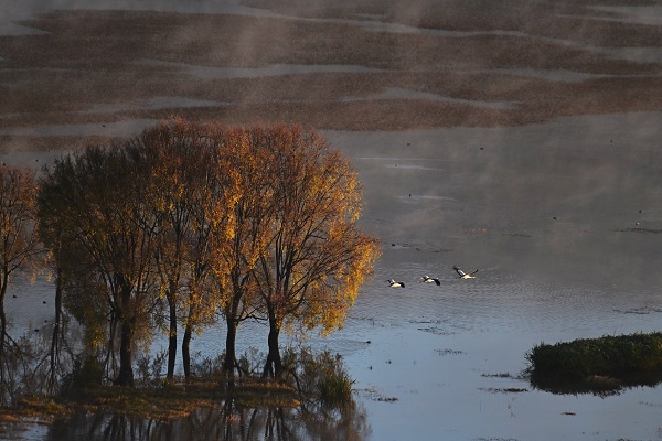 大雪時節(jié),念湖冬景醉人,水杉迎著夕陽矗立,飛鳥排隊掠過湖面,一動一靜,相映成趣。(刀承賢 攝)
