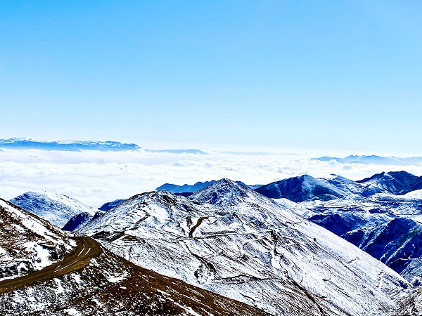 雪后初霽,被薄雪覆蓋的群山之間云海翻騰,宛若一幅美麗的畫卷。(楊劍金 攝)