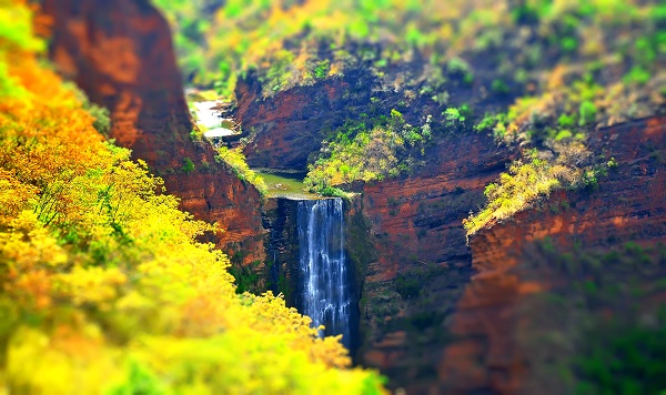 大雪至,昔日飛流直下的三潭瀑布水流驟減,宛如一條蜿蜒的小溪,在冬日暖陽的照射下,與四周五彩斑斕的景色融為一體,美不勝收。(姜云輝 攝)