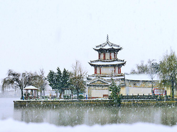 大雪時節(jié),小城迎來了久違的飄雪,紛紛揚揚的雪花讓古樸滄桑的建筑愈顯靜謐典雅。(馮雪娥 攝)