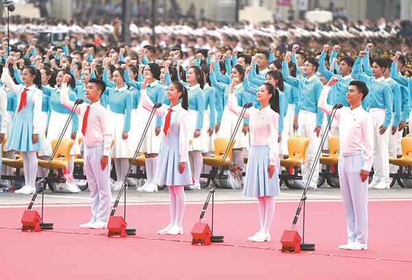 2021年7月1日上午,慶祝中國共產黨成立100周年大會在北京天安門廣場隆重舉行。圖為共青團員和少先隊員代表集體致獻詞。 新華社記者 陳曄華 攝