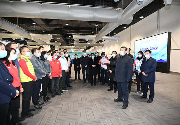 1月4日,中共中央總書(shū)記、國(guó)家主席、中央軍委主席習(xí)近平在北京考察2022年冬奧會(huì)、冬殘奧會(huì)籌辦備賽工作。這是4日下午,習(xí)近平在二七廠(chǎng)冰雪項(xiàng)目訓(xùn)練基地速滑館,向參訓(xùn)運(yùn)動(dòng)員、教練員表示慰問(wèn)。新華社記者 謝環(huán)馳 攝