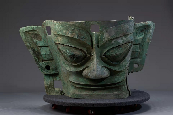 青銅大面具寬131厘米、高71厘米、深66厘米,重131斤,是目前已知三星堆遺址出土的體量最大、保存狀況完好的大型青銅面具。其寬頤廣額、棱角分明,眉部、眼睛、嘴唇等線條流暢、皆突出于面部,粗長眉作揚起狀,面具的兩側上下及額部正中有方形穿孔,可能是用于固定用途。青銅大面具是三星堆文化典型器物,距今已有3000多年,體現了古蜀先民對自然萬物與人神世界的理解與思考。
