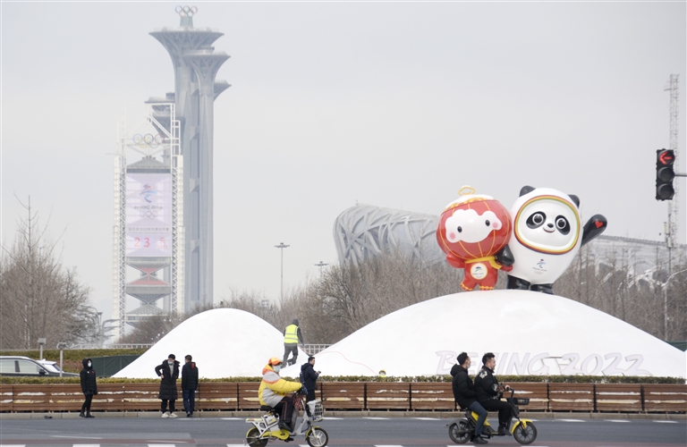 北京奧林匹克景觀大道南端的“冰墩墩”和“雪容融”景觀。新華社記者 李欣 攝