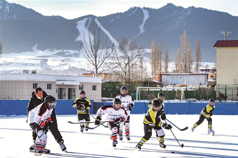 近日,新疆烏魯木齊縣第一中學小學部冰球隊的學生在進行冰球比賽。 新華社記者 王菲 攝