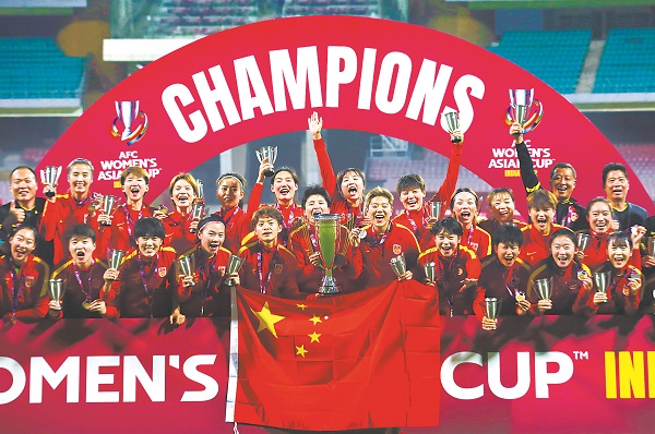2月6日晚,女足亞洲杯決賽在印度舉行,中國女足3︰2逆轉(zhuǎn)戰(zhàn)勝亞洲勁旅韓國隊(duì),奪得冠軍。這是中國女足第9次捧起亞洲杯獎杯,超過其他任何一支球隊(duì)兩倍以上。“女足奪冠”迅速登上熱搜,姑娘們登上冠軍領(lǐng)獎臺、高舉獎杯的一幕令億萬中國人感到驕傲和自豪。