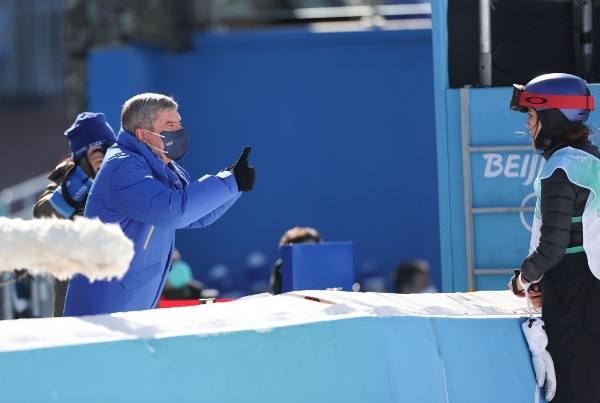2月8日,國際奧委會主席巴赫(左)向中國選手谷愛凌表達祝賀。當日,在北京首鋼滑雪大跳臺舉行的北京2022年冬奧會自由式滑雪女子大跳臺決賽中,中國選手谷愛凌奪得冠軍。新華社記者 丁旭 攝